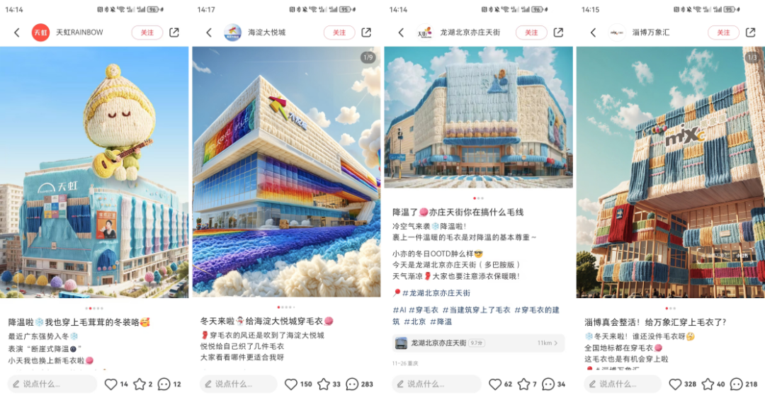 還記得今年冬天那些“穿毛衣”的購(gòu)物中心嗎?首先發(fā)布的一波AI制圖“購(gòu)物中心穿毛衣”海報(bào),確實(shí)有些以假亂真,讓很多消費(fèi)者看到了一群可可愛愛的商場(chǎng)。這些購(gòu)物中心將主形象通過(guò)“穿毛衣”這一事件變得更加擬人化,靠不同的“穿搭風(fēng)格”烘起線上平臺(tái)的話題討論熱度,也讓消費(fèi)者看到了官方的親近與真誠(chéng)。