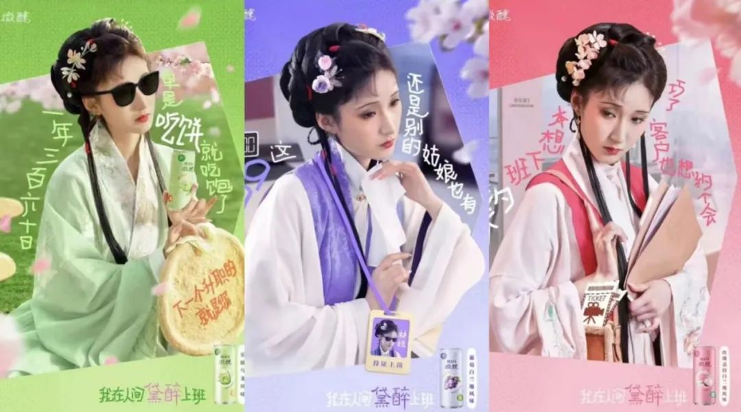 比如在五一調(diào)休這個(gè)社會(huì)熱點(diǎn)話題中,RIO雞尾酒請出了大IP林黛玉,推出一組“我在人間黛醉上班”的海報(bào),每一句都非常“有那味兒”。這組海報(bào)以林黛玉的形象為核心,將她的古典韻味與現(xiàn)代職場生活巧妙融合,每一幅都充滿了獨(dú)特的韻味與深意。