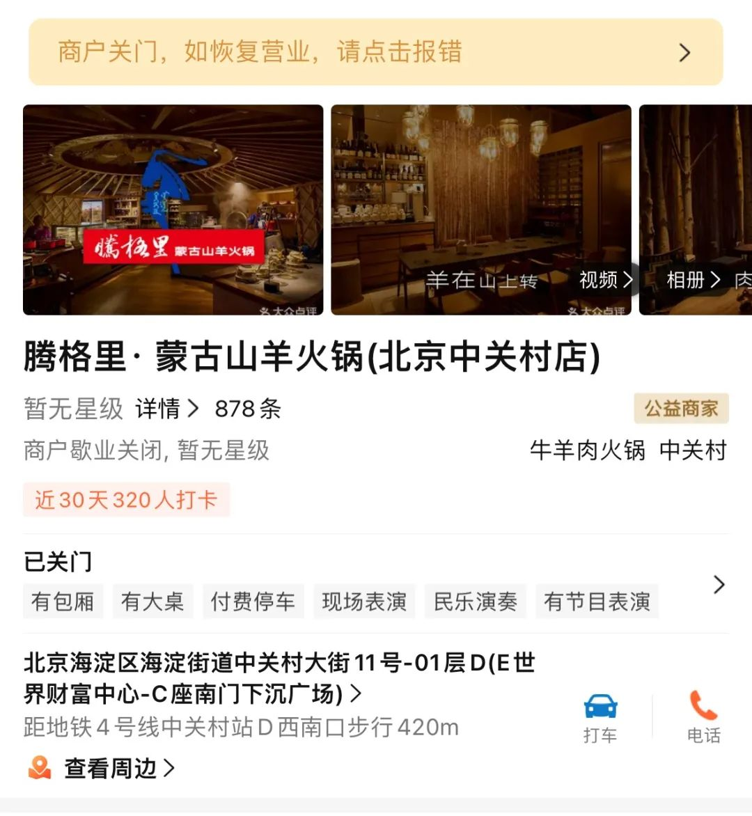 據(jù)大眾點評最新信息顯示,西貝餐飲集團在北京中關村高調推出的子品牌“騰格里蒙古山羊火鍋”全國首店已歇業(yè)關閉。這家曾以現(xiàn)熬羊骨湯、內蒙古二狼山白絨山羊肉為主打賣點,開業(yè)首月即登頂區(qū)域火鍋熱門榜的餐廳,在運營不足半年黯然退場。